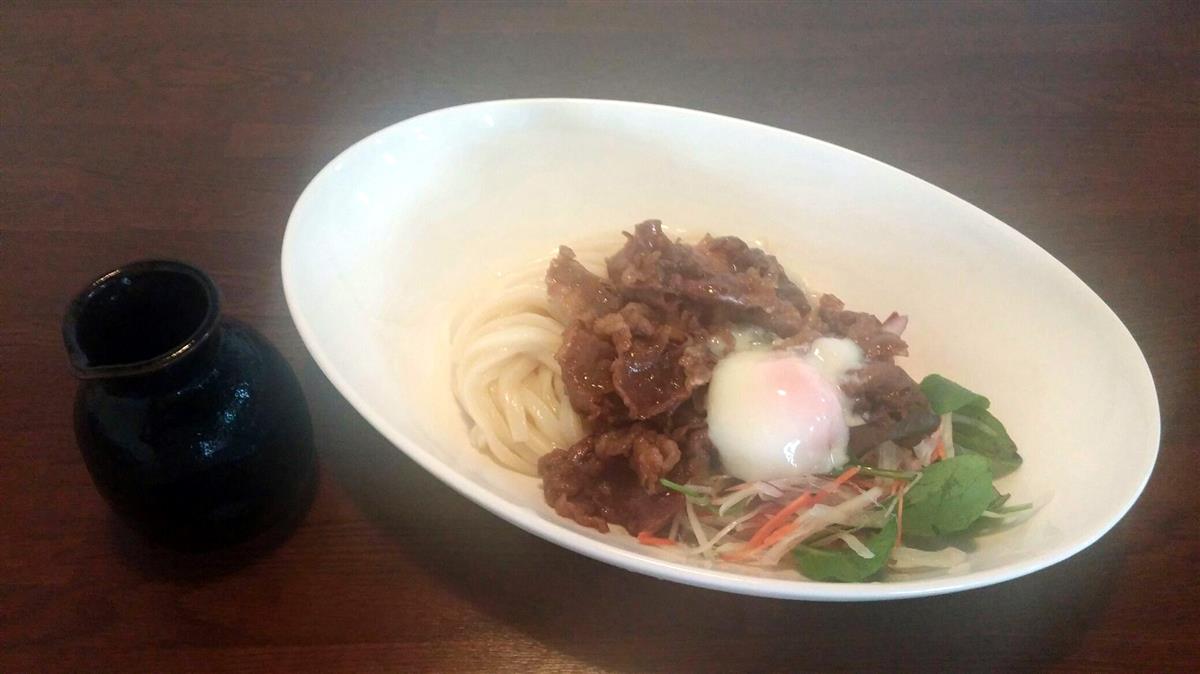 冷やかけうどんに温泉卵をトッピングしました。是非お試しください。
